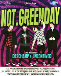 Spokane's newest cover band NOT.GREENDAY makes their live debut on May 21 to an all ages crowd rocking the most loved songs by a certain band we all know. Joined by Deschamp and Unconfined to make the night even more fun! Come sing some of the greatest hits with us!